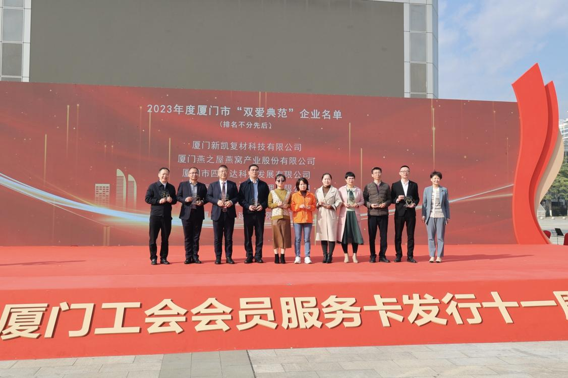 近日,由廈門市總工會、廈門市工商聯(lián)、工商銀行廈門分行共同舉辦的“雙愛雙促·共創(chuàng)美好”暨工會會員服務日活動圓滿舉行。在“雙愛典范”頒獎儀式上,燕之屋榮獲2023年度廈門市“雙愛典范”企業(yè),燕之屋創(chuàng)始人、執(zhí)行董事兼董事長黃健代表領獎。