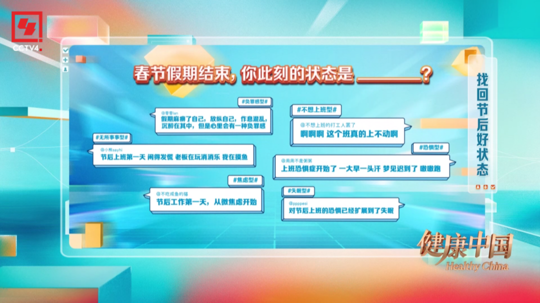 本期《健康中國(guó)》邀請(qǐng)到三組頗具特色的嘉賓。第一組嘉賓張曉彤和他的朋友劉睿文,一位是體育愛好者,一位是上班族。愉快的假期過后,劉睿文卻在節(jié)后第一天提不起精神,面對(duì)身體出現(xiàn)的不適感,讓她無所適從,節(jié)目中專家在線支招。