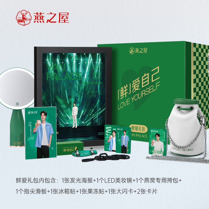 此外,王一博同款燕之屋鮮愛禮盒以青春張揚(yáng)的綠色為主色調(diào),充滿鮮活氣息;禮盒還附贈(zèng)“YIBO”“鮮”愛周邊禮包,包括發(fā)光海報(bào)、LED美妝鏡、燕窩專用挎包、指尖滑板、冰箱貼、果凍貼、大閃卡、卡片,不同規(guī)格享不同禮遇。驚喜與品質(zhì)兼具,王一博同款燕之屋鮮愛禮盒一經(jīng)上線,便掀起搶購(gòu)熱潮,贏得了廣大年輕消費(fèi)者的喜愛。