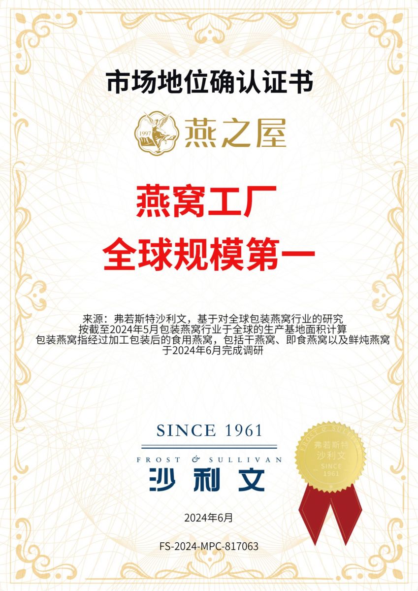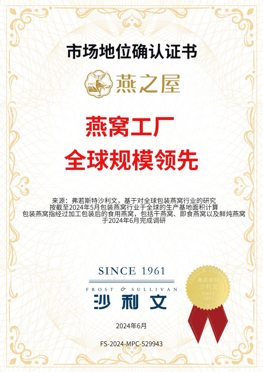 再顯實力!燕之屋獲沙利文市場地位確認(rèn)證書,燕窩工廠全球規(guī)模第一